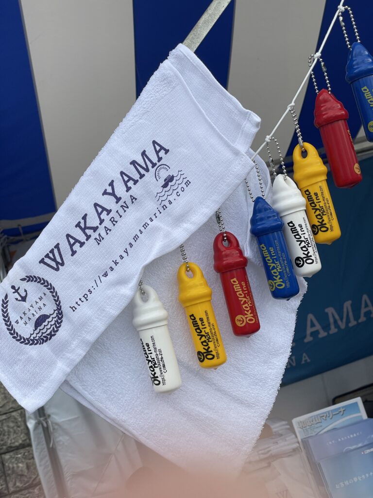 お声掛けいただきました来場者様にタオルやフローティングキーホルダーなど、