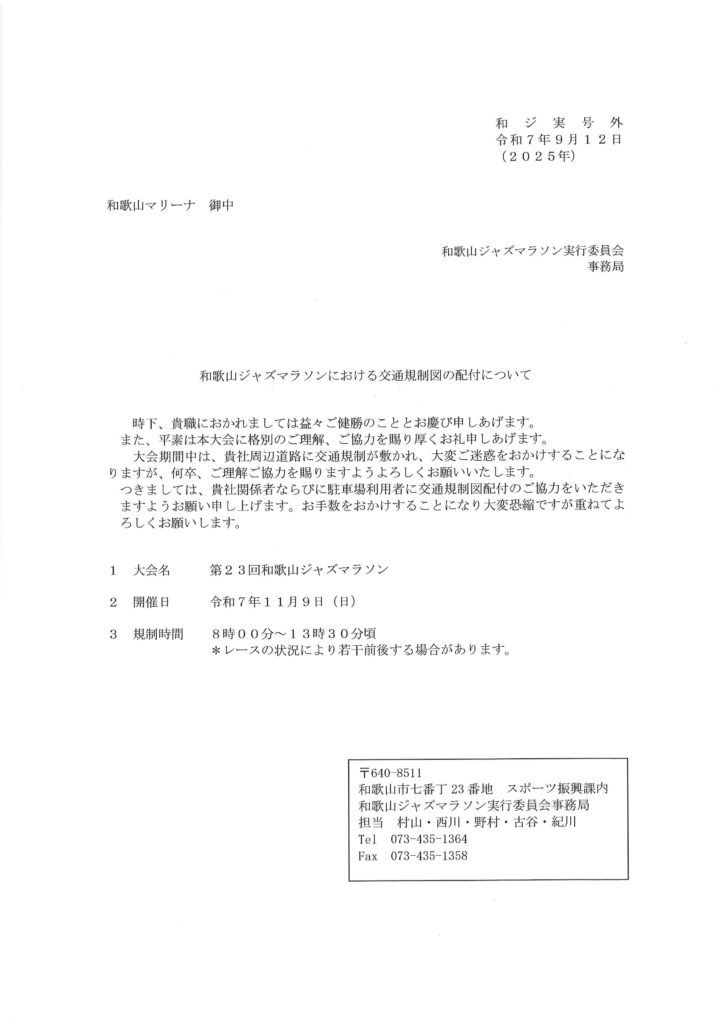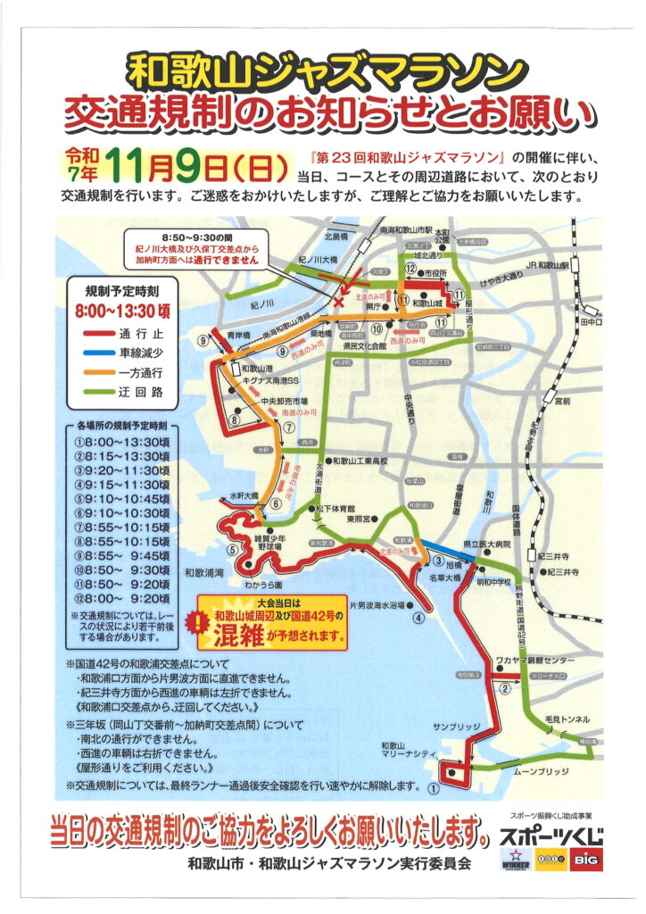 上記日程にて、和歌山ジャズマラソン開催に伴い交通規制が実施されます。開催中8:00から13:30の間、当マリーナまでの道路が封鎖されるため、車両での進入が出来ません。ご来場ご利用の際は、ご注意いただけますようお願い申しあげます。